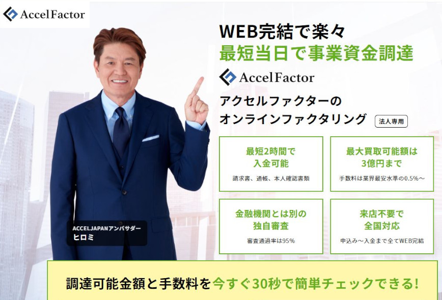低水準の手数料0.5%〜/オンライン完結のファクタリングサービス【アクセルファクター】